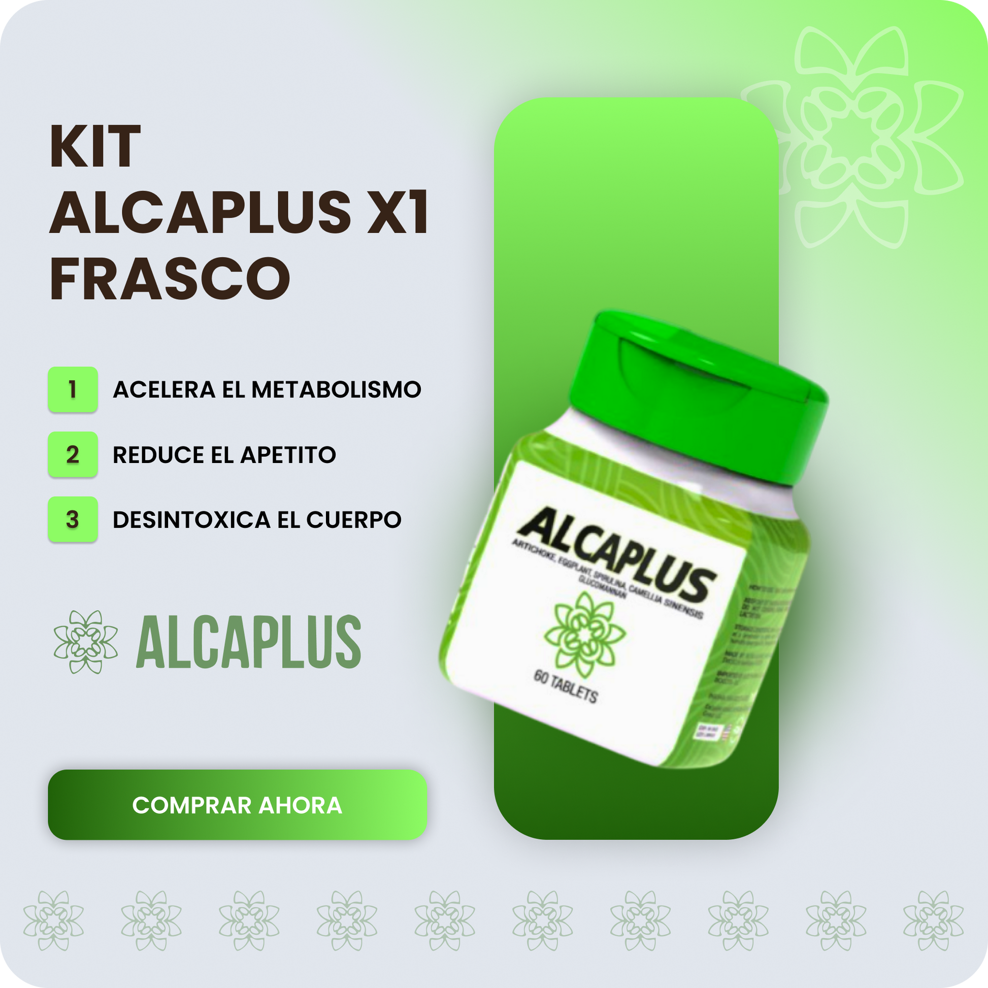 Alcaplus es un suplemento nutricional natural, líder en Estados Unidos, diseñado para promover la pérdida de peso sin efecto rebote. Este kit incluye tres frascos de 60 cápsulas cada uno, junto con un obsequio a elegir entre un termo, shaker o alcancía, y un folleto informativo. Formulado con ingredientes activos como alcachofa, berenjena, espirulina, camelia sinensis, glucomanano y té verde, Alcaplus ayuda a reducir el apetito, quemar grasa acumulada, acelerar el metabolismo y mejorar el bienestar general.